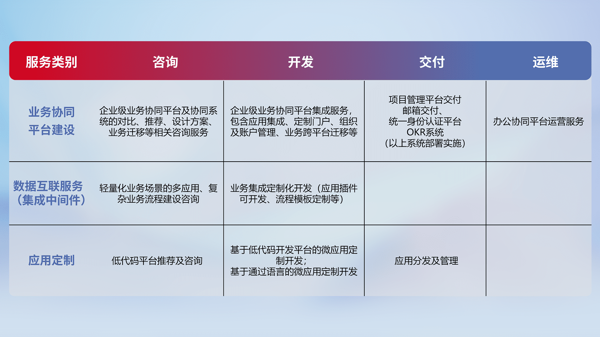 针对钉钉、、企微、、IDaas等平台级产品提供产品的规划、、、、方案、、、、交付、、、、定制化开发等服务,,实现如统一协同办公、、、智能客户服务、、混合会议管理、、、、智能数据查询、、、、等业务场景,,实现数字化转型。。。。